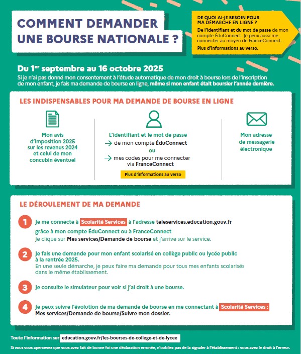 Nous vous informons de l’ouverture de la campagne de demande de bourse des collèges pour l’année scolaire 2025-2026 du 1er septembre au 16 octobre 2025 inclus.