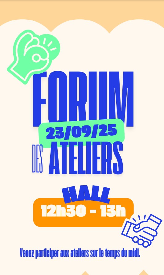 Mardi 23 Septembre, le forum des ateliers aura lieu dans le hall de 12h30 à 13h.