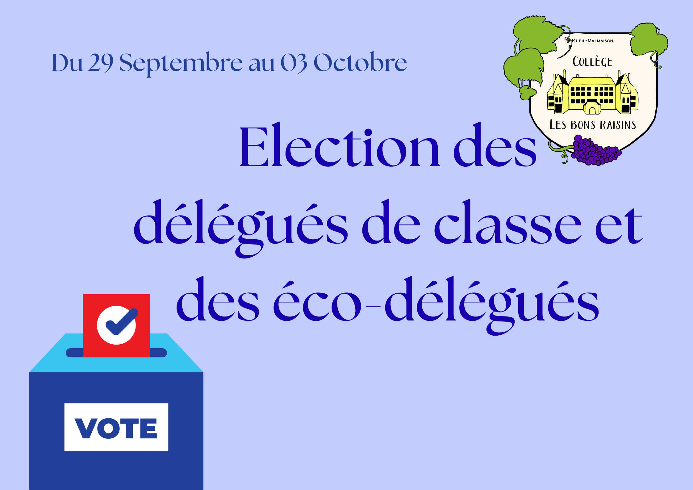 Les élections des délégués de classe et des éco-délégués ont lieu la semaine du 29 Septembre au 03 Octobre.