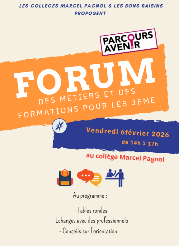 Cette année, les collèges Les Bons raisins et Marcel Pagnol organisent en commun un forum des métiers le vendredi 6 février 2026 de 14h à 17h au collège Marcel Pagnol.